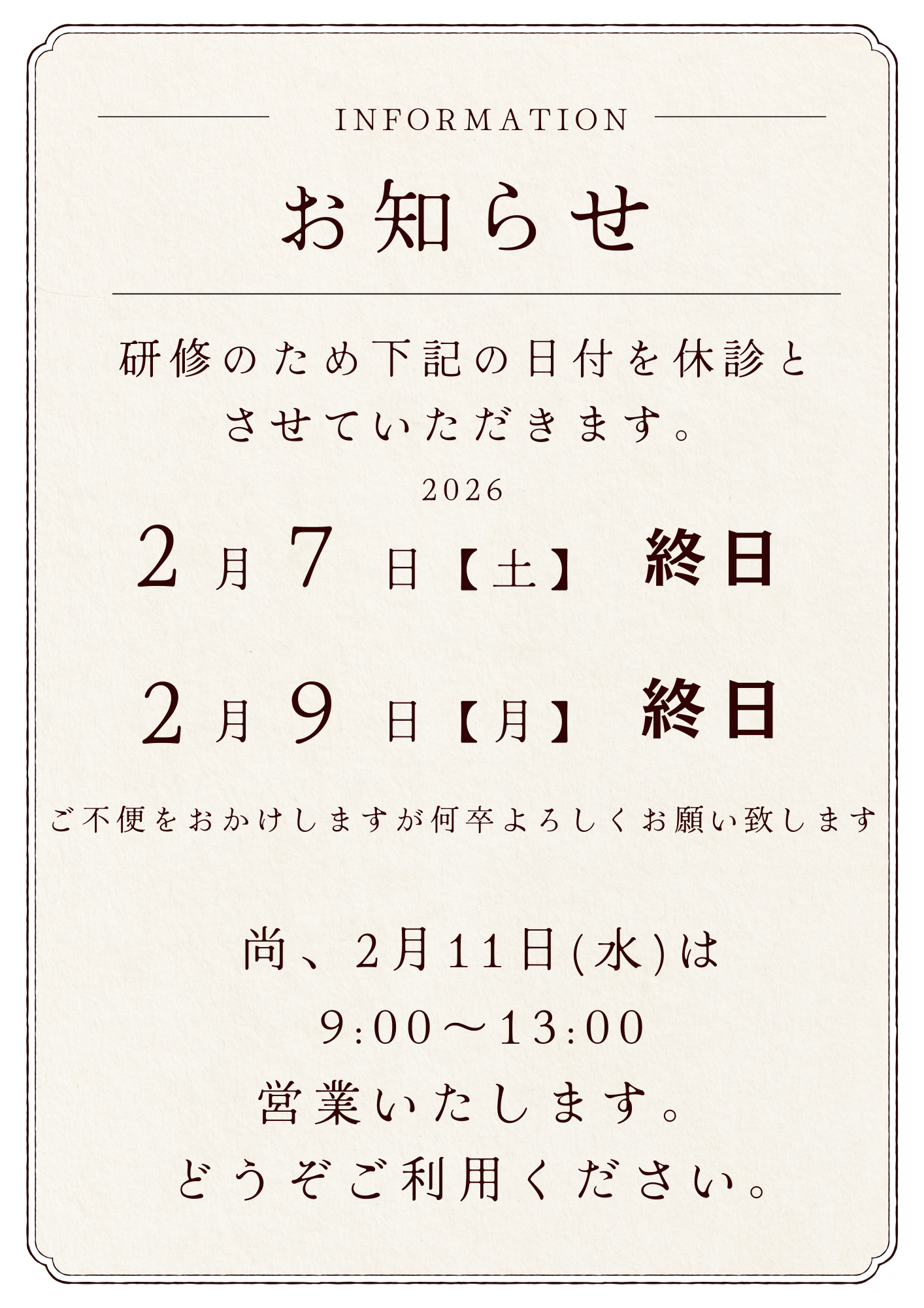 2月の休診日のご案内です。
