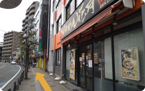少し歩くと、らーめん花月さんが見えてきます。その前を直進して下さい。