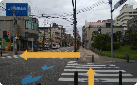その先に交差点があるので、橋本駅を背中にして、矢印の方向に進みます。