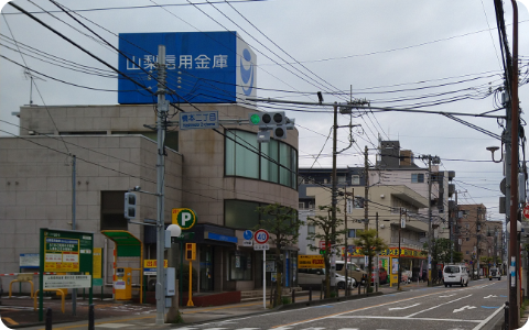 渡ってすぐ左の横断歩道を渡ると、山梨信用銀行が見えてきます。
